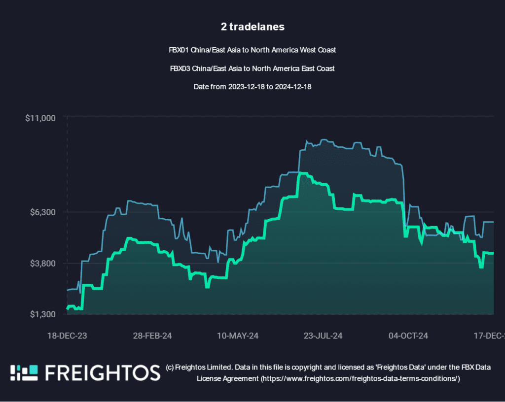 - Les tarifs entre l’Asie et l’Amérique du Nord ont baissé en raison d’une moindre urgence liée aux vacances, mais ils pourraient augmenter dans les semaines à venir.